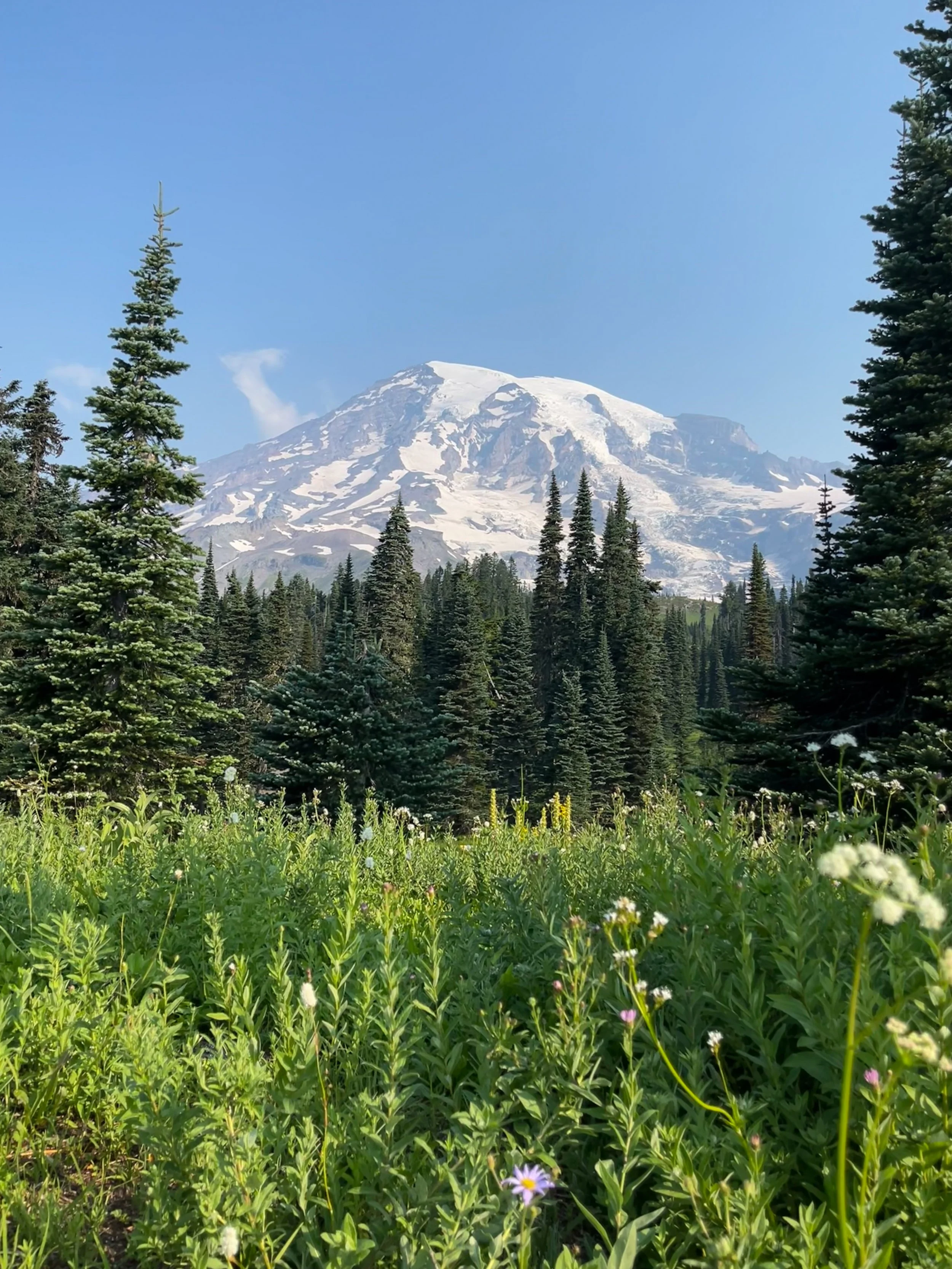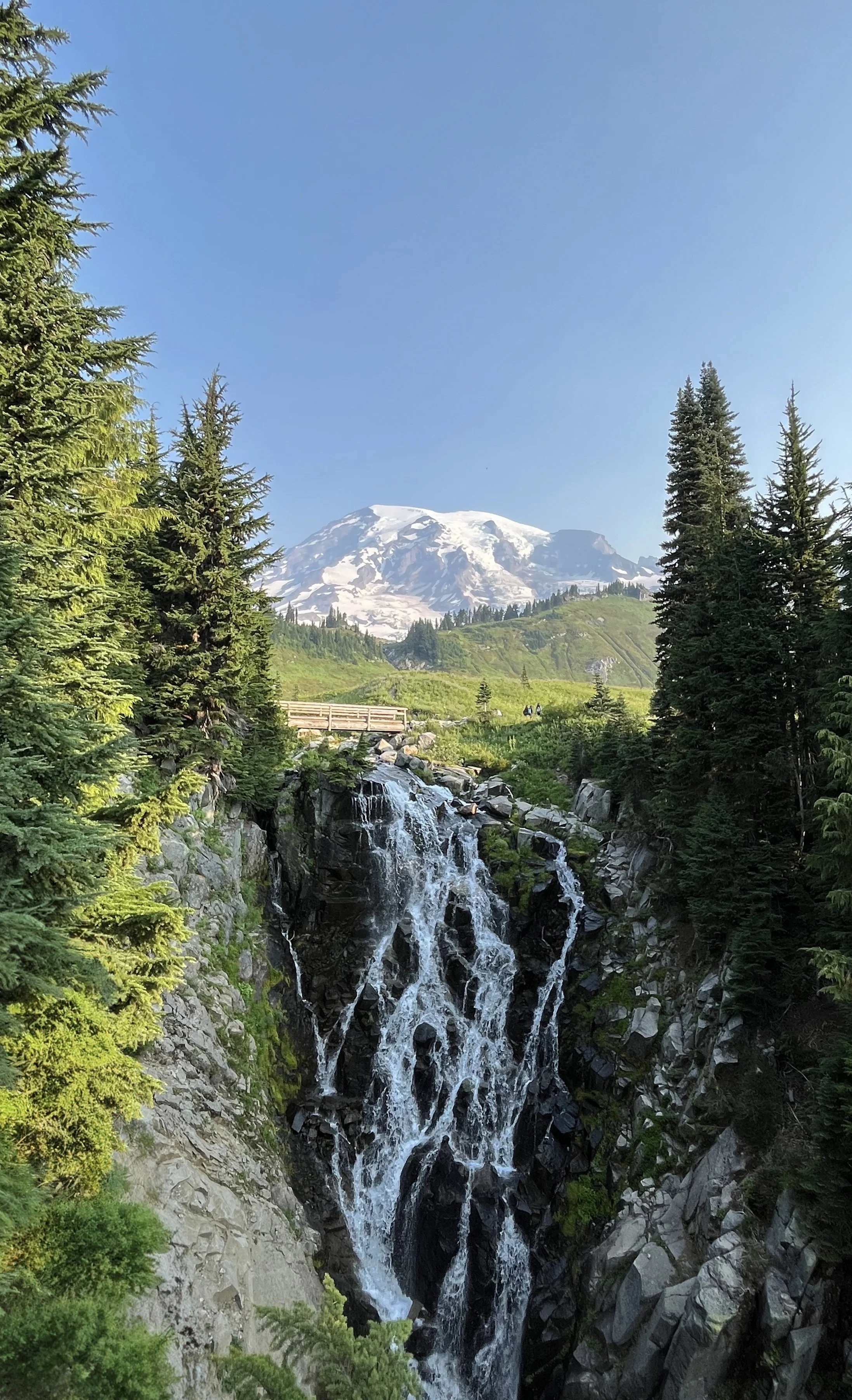 They call it Paradise for a reason. The moment we arrived, we were put in awe. Amidst the breathtaking scene, we spotted a deer galloping through the lush green fields full of flowers. During that time of year, wildflowers in every color were blooming along the way to Myrtle Falls. I highly recommend this spot - it’s a picture-perfect, Switzerland-like scene. The mountain stands tall in the background, the bridge goes across the stream, and the water falls off the ledge. It’s straight out of a postcard.