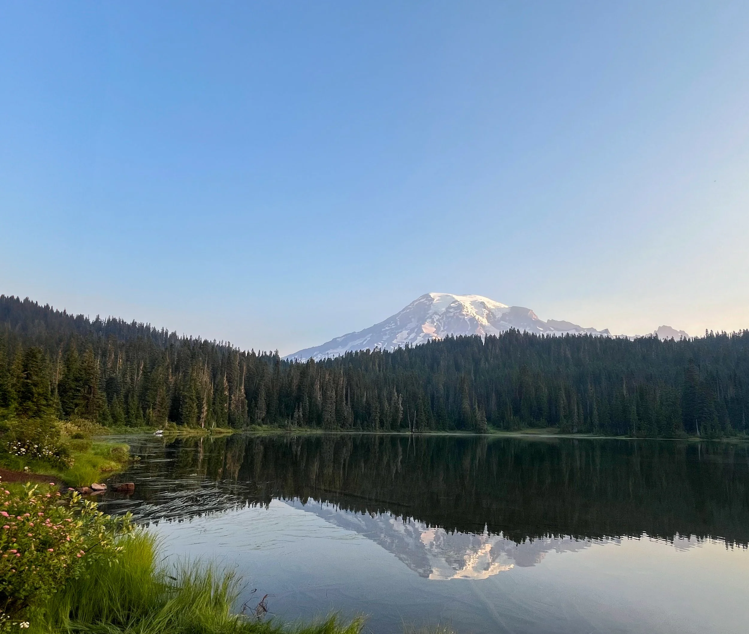 When we arrived at Reflection Lake, the air was cool and crisp. The sun was just beginning to rise. And then - I saw it. My first real view of Mount Rainier. It was spectacular. As the bright orange sun emerged from the distant peaks, it cast a shimmer of gold across the lake. Mount Rainier reflected perfectly on the water. I felt the need to pinch myself in this moment.